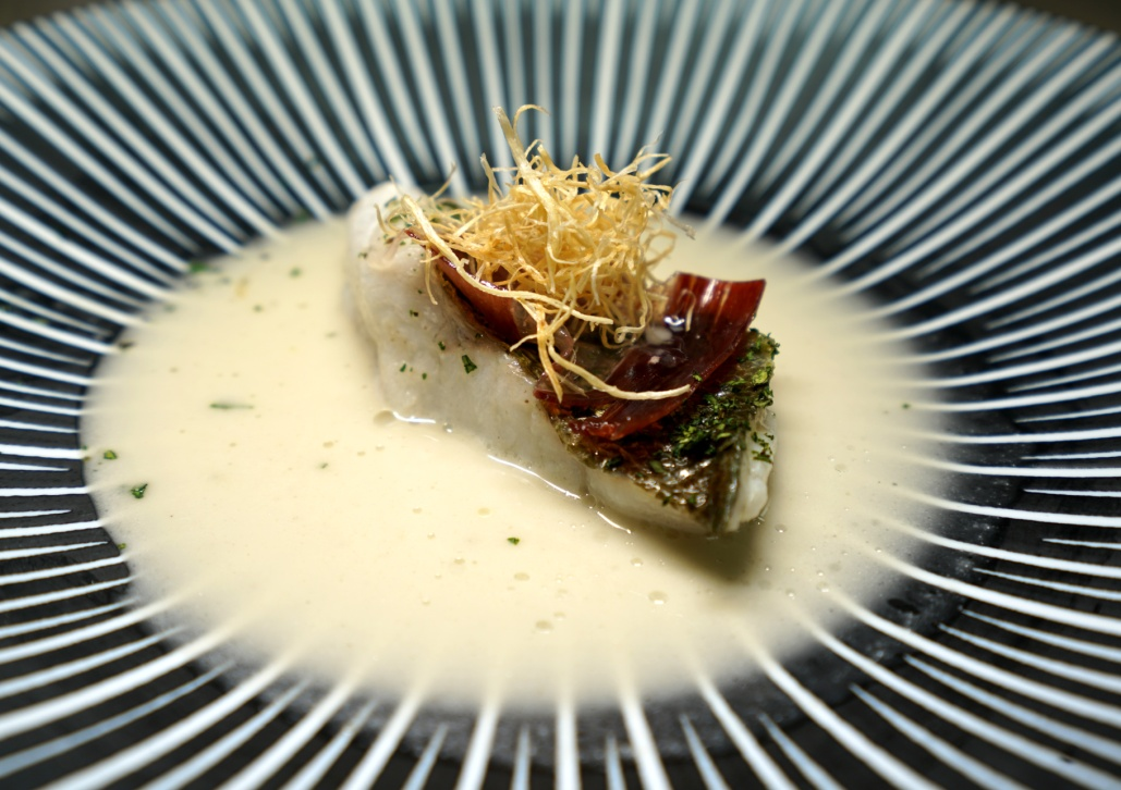 实操菜品:传统鲁菜技法运用于新式食材及米其林摆盘技巧——醋椒炙烤海钓大黄鱼配西班牙火腿