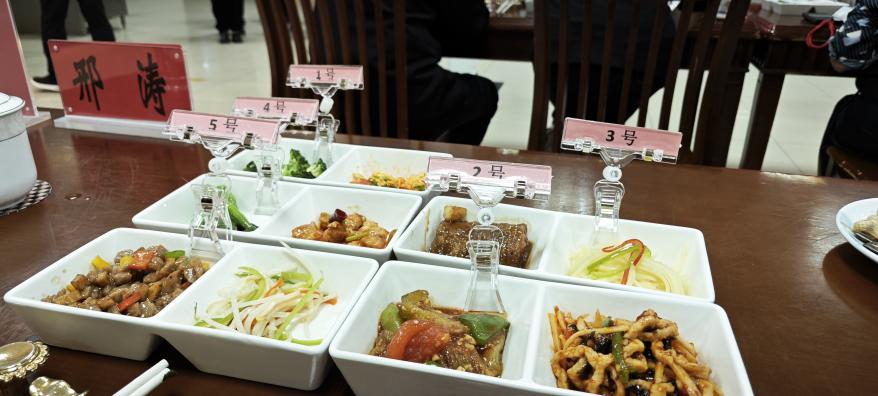 比赛共三个环节。一是规定菜品赛,考验基础功底。要求以“家常菜”为主题,在40分钟内完成2道菜品(需符合政府食堂“少油少盐、营养均衡”标准)。每组分别抽取一荤一素。二是创意菜品赛,体现特色与创新。要求围绕“健康轻食”“地域特色”“光盘行动”3个方向任选其一,自主设计1道菜品。三是现场答题环节,针对机关食堂的特点,考核注重食品安全、日常操作规范、常见食材处理、基本烹饪知识。